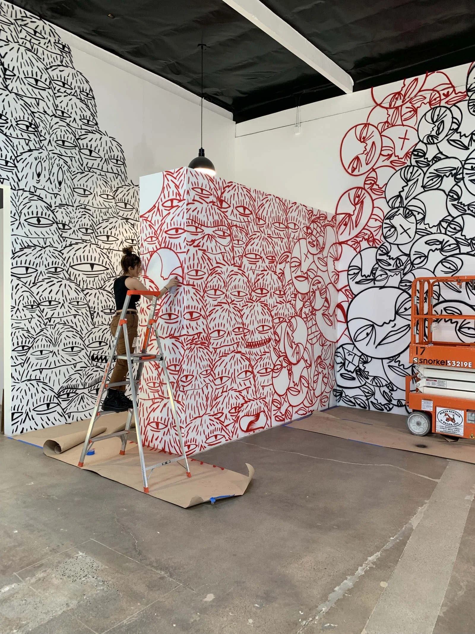 The client, rooted in urban and streetwear fashion, sought to infuse their office with a mural that mirrors their grungy, graffiti-inspired brand identity. Opting for a bold red and black theme, they incorporated Evan Rossell and Dee Rosse's HairyFools and Rosse characters, aiming to energize the workspace and make a statement in the street-style scene. This mural project not only aims to boost morale and creativity among employees but also to impress clients with its urban edge and brand-aligned aesthetics.